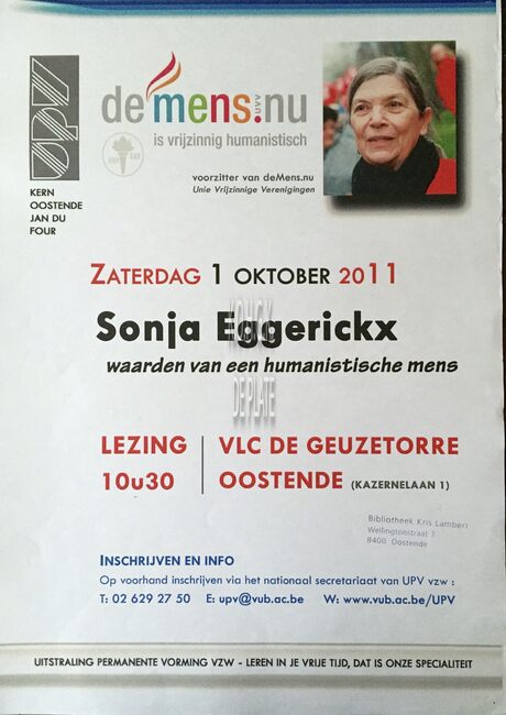 Formaat: 42 x 30 cm Sonja Eggericks, voorzitter van deMens.nu, Unie Vrijzinnige Verenigingen UPV, Kern Oostende Jan du Four www.vub.ac.be/UPV