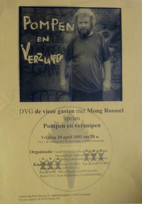Affiche : Oudervereniging voor de Moraal Oostende, Hum. Verbond Oostende en VLC Oostende. Pompen en Verzuipen. VLC De Geuzetorre. vrijdag 20 april 2001