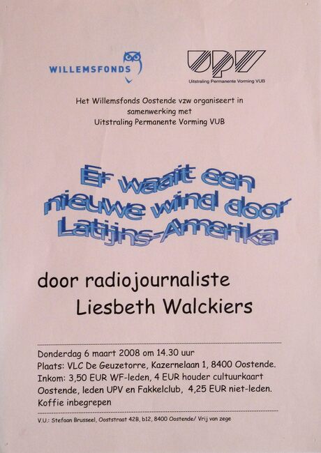 Affiche : Willemsfonds. Er waait een nieuwe wind door Latijns-Amerika. VLC De Geuzetorre. 6/03/2008