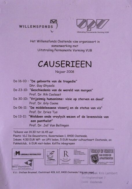 Affiche : Willemsfonds. Causerieen najaar 2008. Oostende. 16/10 tot 13/11/2008