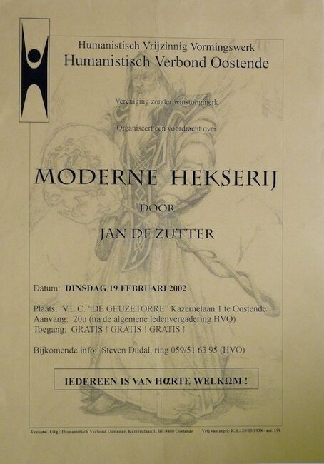 Affiche : Humanistisch Verbond Oostende. Moderne Hekserij. VLC De Geuzetorre. 19/02/2002.