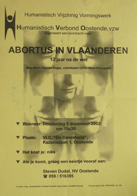 Affiche : Humanistisch Verbond Oostende. Abortus in Vlaanderen. VLC De Geuzetorre. 5/12/2002.