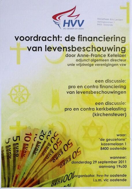 Affiche : Humanistisch Verbond Oostende. Voordracht : "De financiering van levensbeschouwing". VLC De geuzetorre. 29/09/2011.