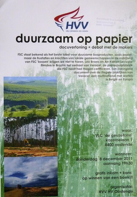 Affiche : Humanistisch Verbond Oostende. Film : "Duurzaam op papier", docuvertoning + debat met de makers. VLC De Geuzetorre. 8/12/2011.