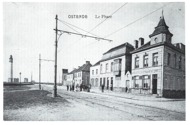 Ostende. Le Phare. Links met gekanteeld torentje, het huis van weduwe Surveillant. Op de hoek met de Blankenbergestraat, met torentje, de estaminet van Pol Vanloo-Metsu. Achter het groepje inwoners ligt…