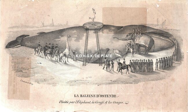 Litho : La baleine d'Ostende visitée par l'éléphant, la giraffe et les osages