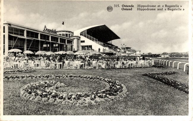 Formaat : 9 x 14 cm. - Albert, N°315. Photoplastifix A. Dohmen, Bruxelles. - Ostende - Hippodrome et "Bagatelle". Ostend - Hippodrome and "Bagatelle". - De hoofdtribune en de taverne "La Bagatelle…
