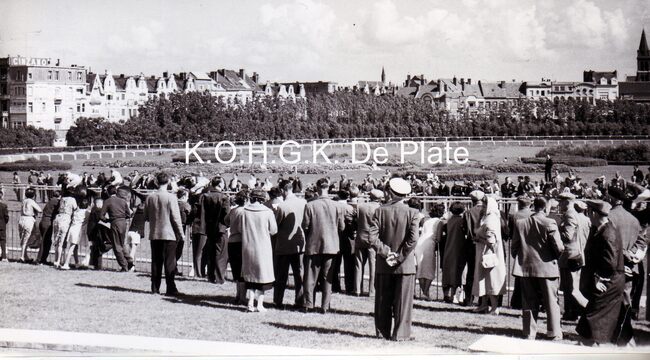 Foto 18 x 10. Veel volk op de Wellingtonrenbaan rond de paddock. In de achtergrond de Sportstraat
