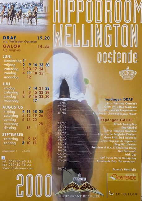 Formaat : 42 x 30 cm. topdagen DRAF. 14/07 Prijs Toerisme Oostende. 28/07 Grote Prijs van de Stad Oostende. 11/08 Prijs van de Burgemeester. 03/09 Afsluitende Champagneprijs 'Binet'. topdagen GALOP. 24/06 British Racing…