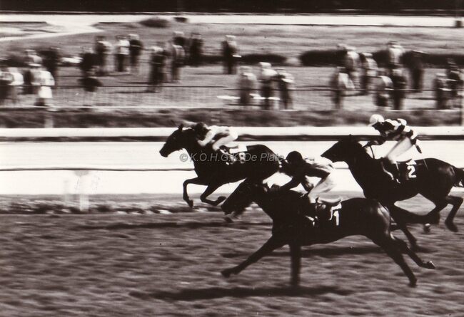 Veldloop Hermes op de Wellington renbaan aande grote tribune.Op de achtergrond de 17 oktoberstraat met links het Buckingham hotel en rechts de "Sacre Coeur" de huidige Katholieke Industriële Hogeschool.