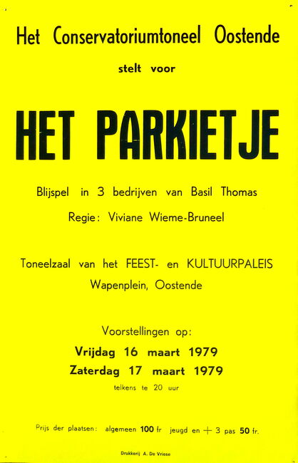 Formaat : 8,5 X 12 cm. - Conservatoriumtoneel als laureaat met éénakter "De 50ste voorstelling" te Mechelen in 1969. We zien hier Michiel Van der Straeten, Viviane Bruneel en Octaaf Defoor,