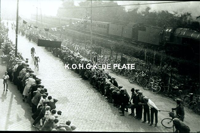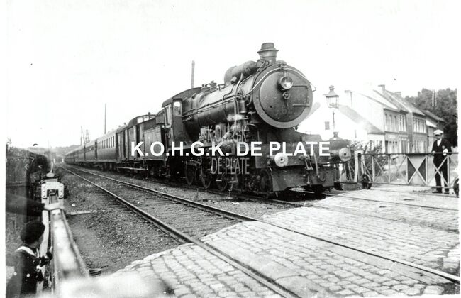Formaat : 10 x 15 cm. - Aankomst van de beginnelingen in de Gouwelozestraat. Er passeert juist een trein.