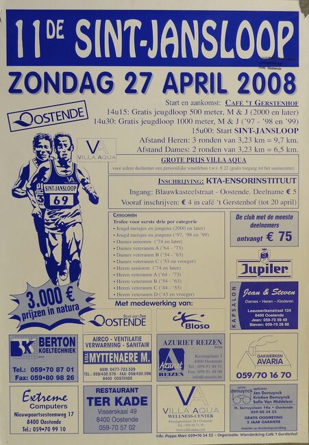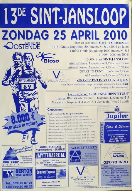 Formaat: 61 x 43 cm. Start en aankomst: Café 't Gerstenhof. 14u15: Gratis jeugdloop 500 meter, M & J (2000 en later). 14u30: Gratis jeugdloop 1000 meter, M&J ('97 - '98 en '99) 15u00: Start SINT-JANSLOOP. Afstand…