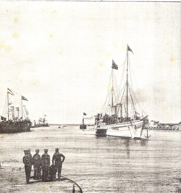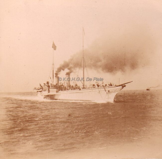 Formaat : 7.5 x 7.5 cm. - Het jacht "Hohenzollern" met aan boord de Duitse Keizer Wilhelm II nabij de haven van Oostende