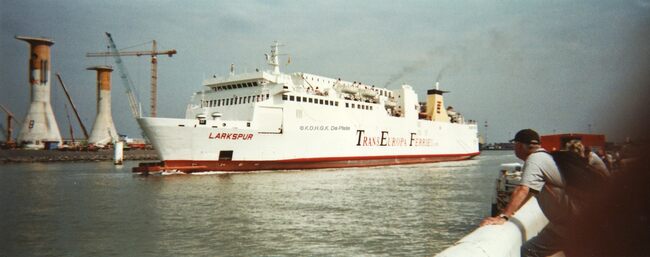 Formaat : 10 x 15 cm. - Bouw van de betonnen sokkels van de windmolens op de oosteroever. De "Larkspur" vervoerde vracht en passagiers voor de rederij Trans Europa Ferries op de lijn Oostende - Ramsgate in de…