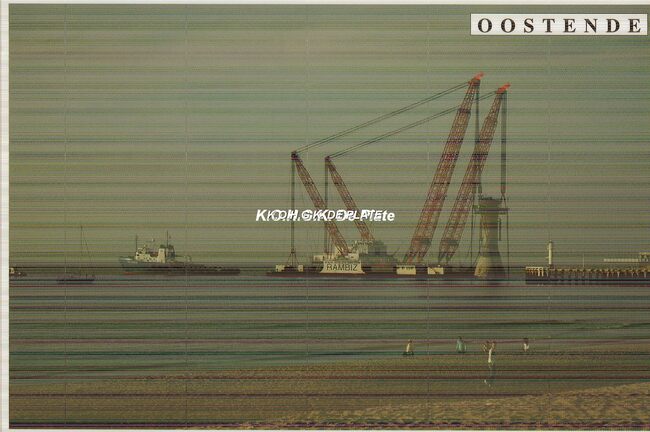 Formaat : 10 x 25 cm. - Bouwen van de zes kandelaars voor het windmolenpark op de Thortonbank in de Noordzee. In de achtergrond vuurtoren Lange nelle. Hefschip Rambiz aan het werk en patrouillevaartuig SPN-15 van de…