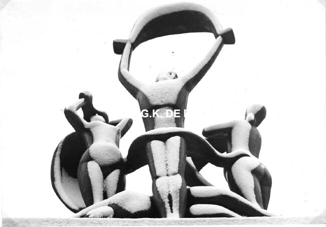 Formaat : 13 x 18 cm. - Het ondergesneeuwde beeld De Zee of Dikke Mathille van Georges Grard, op haar oorspronkelijke plaats aan het Kursaal.