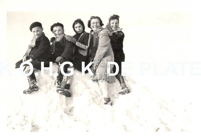 Formaat : 9 x 14 cm. - De overgebleven toren van de vroegere Vleesmarkt, vernield tijdens de Tweede Wereldoorlog. Sneeuwpret op het Mijnplein