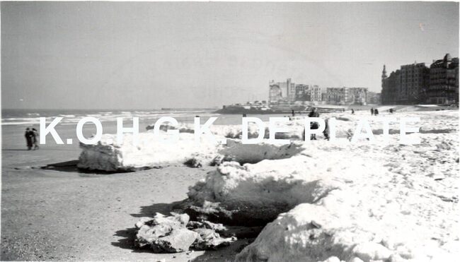 Het strand van Mariakerke onder sneeuw en ijs bij laag tij. Het huis met de zwarte zijgevel is villa Osterrieth, op de hoek van de Northlaan.