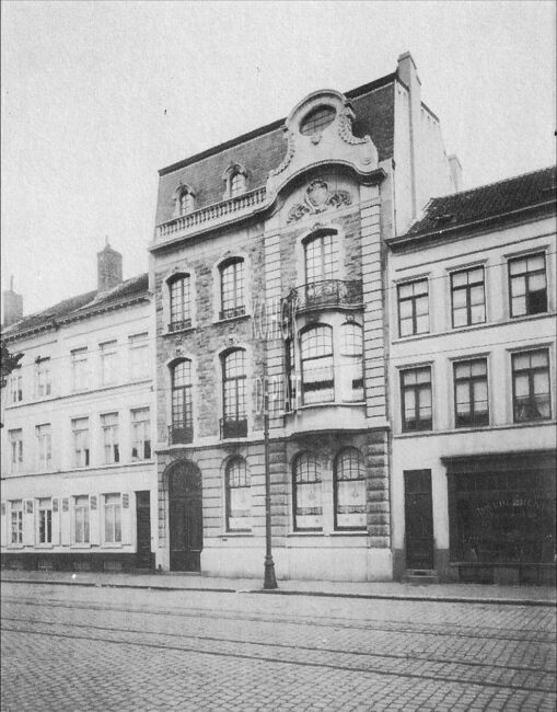 Interieur. Trappenhuis met marmeren trap en giet- en smeedijzeren leuning en siervazen