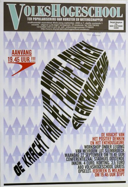 Affiche : Volkshogeschool. De kracht van het positief denken en enthousiasme. Conferentiezaal stadhuis Oostende. 22/09/2008