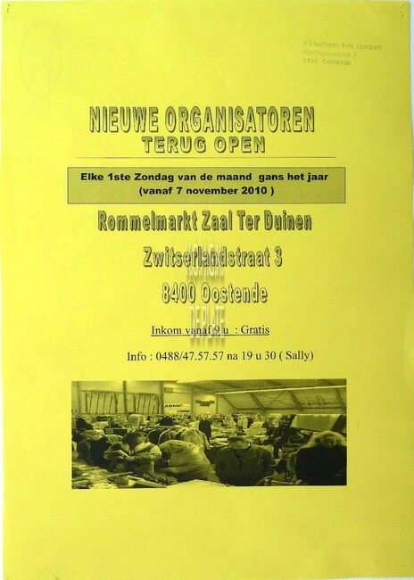 Formaat : 42 x 30 cm. Nieuwe organisatoren, terug open. Elke 1ste zondag van de maand gans het jaar (vanaf 7 november 2010). Rommelmarkt zaal Ter Duinen, Zwitserlandstraat 3, 8400 Oostende
