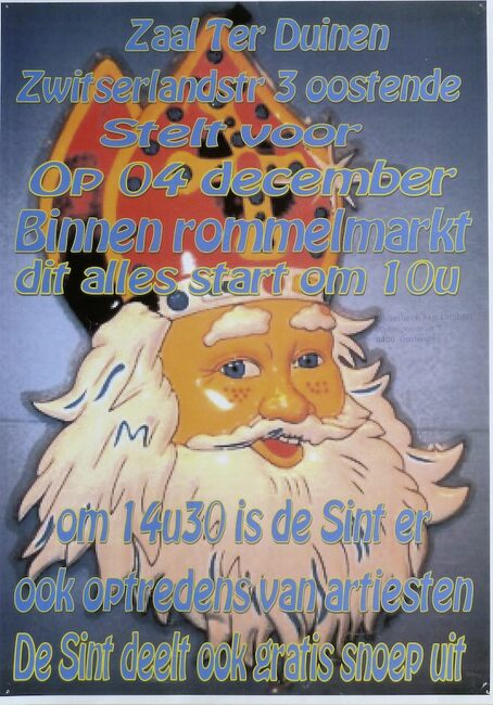 Formaat : 42 x 30 cm. Zaal Ter Duinen. Zwitserlandstraat 3, Oostende. Om 14u30 is de Sint er. Ook optredens van artiesten. De Sint deelt ook gratis snoep uit.
