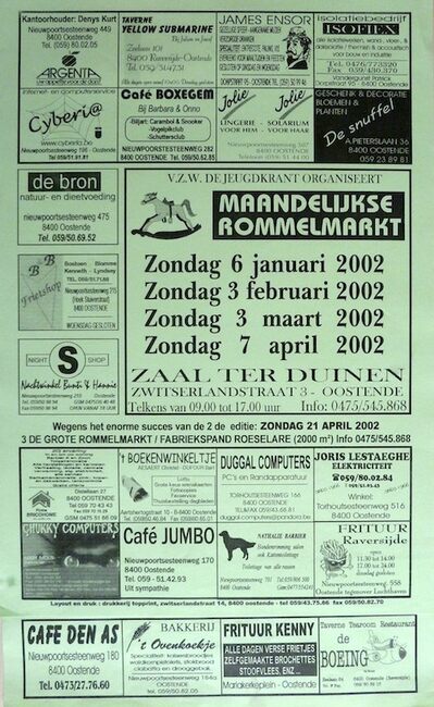 Affiche : vzw De Jeugdkrant. Maandelijkse rommelmarkt. Zaal Ter Duinen. 06/01 - 03/02 - 03/03 en 07/04/2002