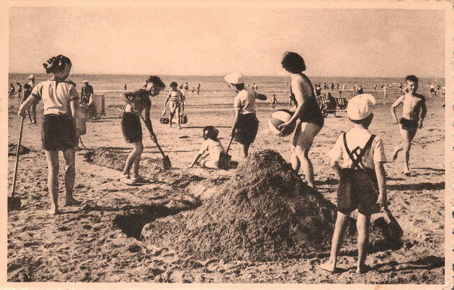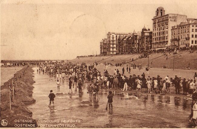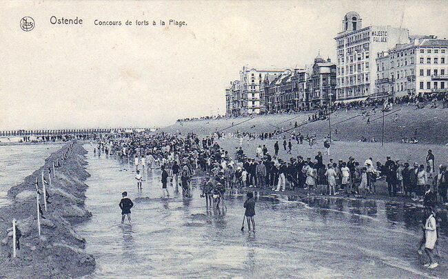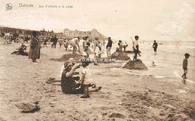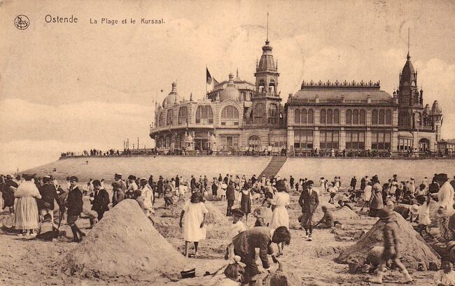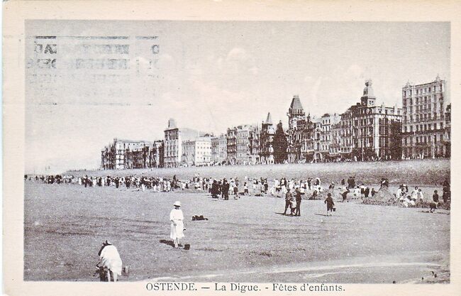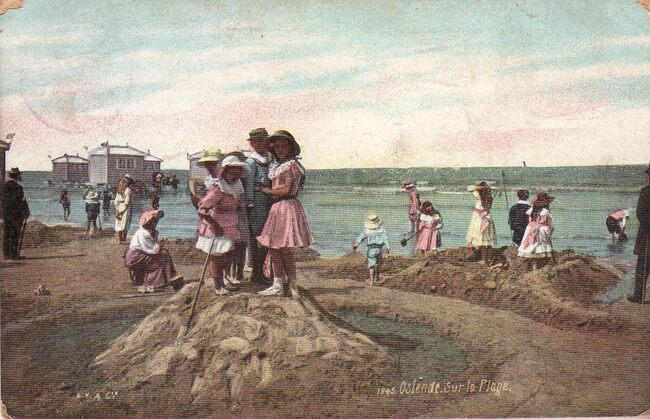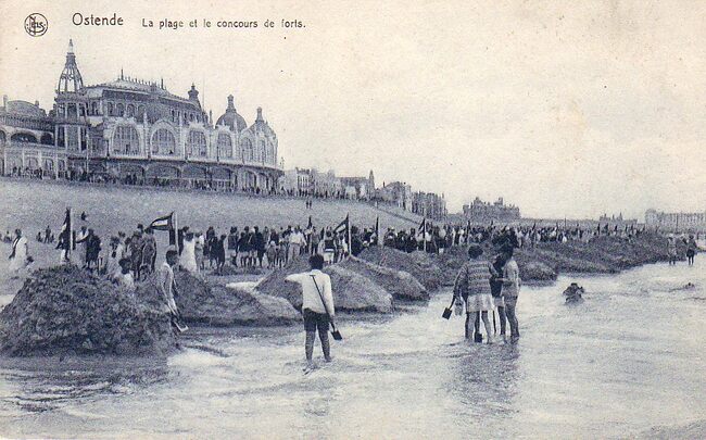 Ostende, la plage. Kinderen maken een fort (zandkasteel) tegen het opkomend water (vloed), de badkarren tegen de zeedijk. De Zeedijk met de grote hotels, het Koninklijk Chalet en op het einde het Royale Palace Hotel…
