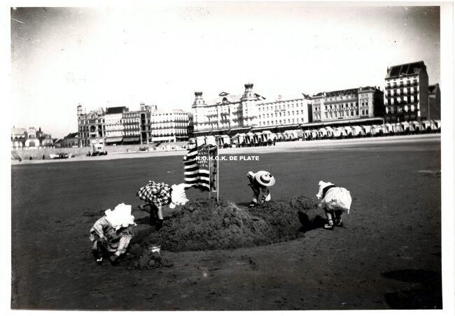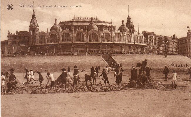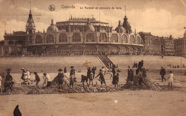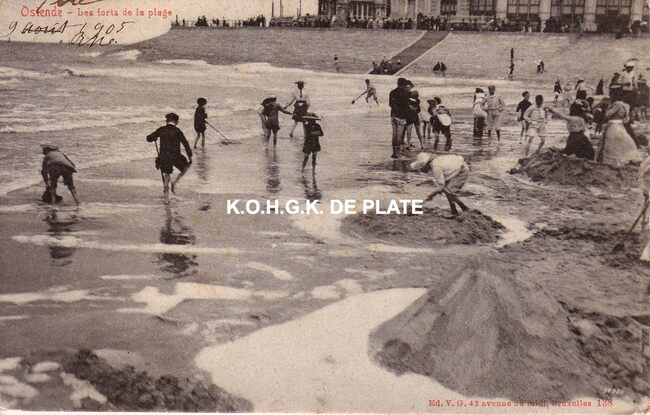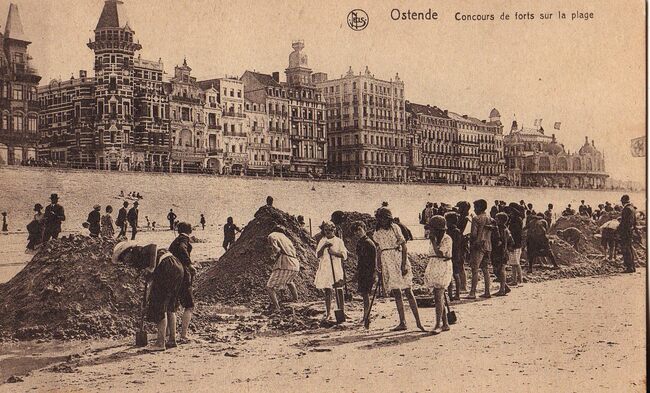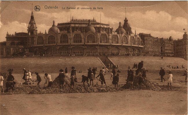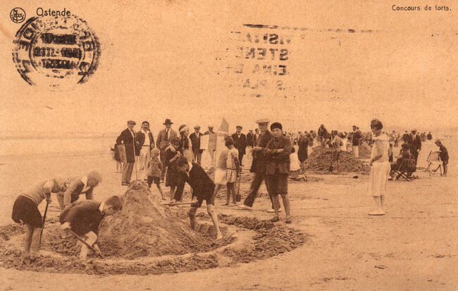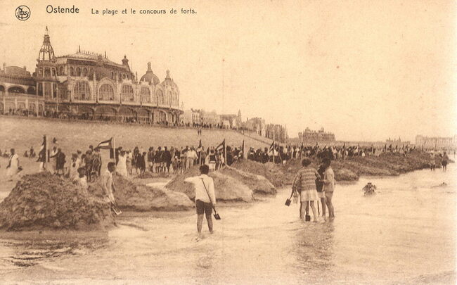 Formaat : 12,5 x 17,5 cm. - Een "fort", of zandkasteel bouwen op het Groot Strand tijdens de Belle Epoque. Ook volwassenen deden het. Op de achtergrond, een gedeelte van de westgevel van het tweede Kursaal langs de…