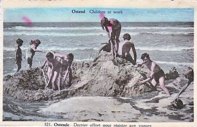 Albert , N° 521. - Ostende - Dernier effort pour résister aux vagues. Ostend - Children at work. - Bijgekleurde kaart. - Kinderen bouwen een "fort", of zandkasteel