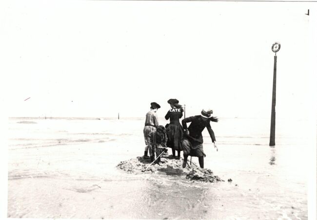 Nels. - Ostende - Concours de forts à la plage. - Wedstrijd "forten" of zandkastelen bouwen op het Groot Strand. De vloed heeft de zandkastelen bereikt. Wie het langst zijn vlag op het "fort" bleef …