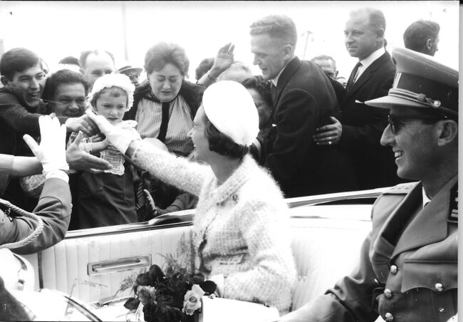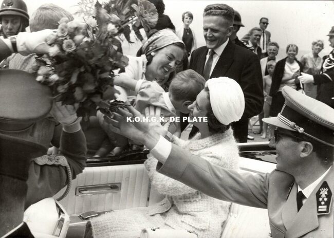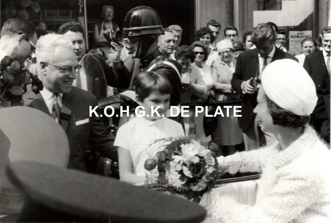 Foto : 13 x 18 cm. Koningin Fabiola wordt begroet door mevrouw Jean-Pierre Duquennes- Bauwens en zoontje