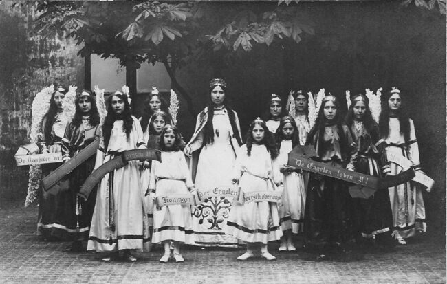 Afdruk van postkaart Phototypie H. Climan-Ruijssers, Anvers, formaat : 9 x 14 cm. - Ostende - La Bénédiction de la Mer. Les enfants des pêcheurs. Oostende - De Zeewijding. - De Ommegang in de Kapucijnenstraat (onder…