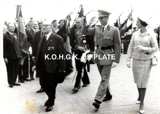 Formaat : 12 x 17 cm. - Koning Boudewijn en Koningin Fabiola op de eretribune op het Zeeheldenplein begroeten een invalide jongen Jean-Pierre Everaert en zijn vader. Links, Pierre Van Outryve d'Ydewalle, gouverneur…