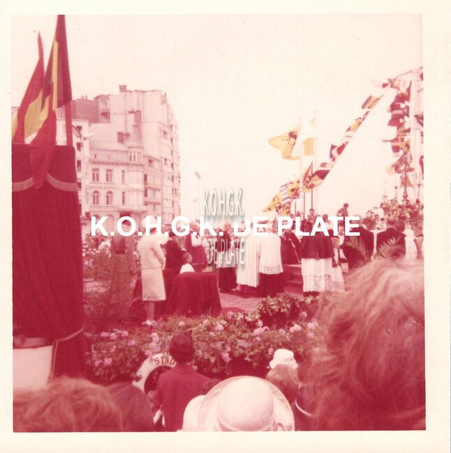 Formaat : 9 x 9 cm. - Koning Boudewijn en Koningin Fabiola wonen de mis bij op het Zeeheldenplein.