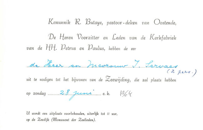 Van kanunnik R. Butaye aan de heer en mevrouw J. Servaes tot het bijwonen van de Zeewijding op 28 juni 1964