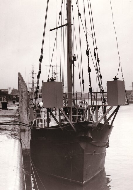 Het radiopiratenschip "Magda Maria" aangemeerd op het einde van de haven. Zie ook inventarisnummer 2014/1323