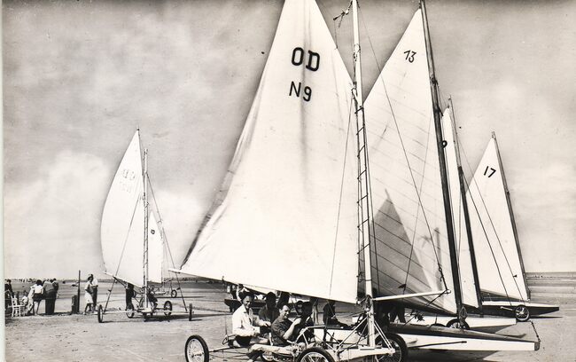 Illustraties : (1) Zeilwagenverhuur op het strand van Mariakerke (1950) en (2) Simon Stevin