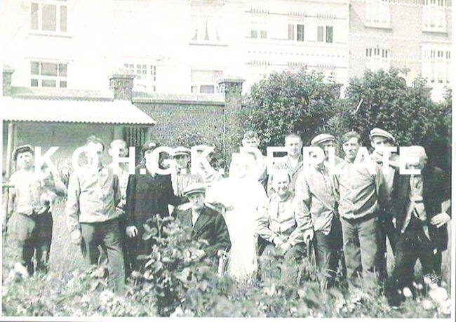 Afdruk. Formaat : 13 x 18,5 cm. Links Sylvère Vansteelandt. In het midden zuster Martha met patiënten en bewoners van het rusthuis. Achter de muur is de Kaïrostraat te zien. Het gedeelte tussen de Jules Peurquaetstraat en…