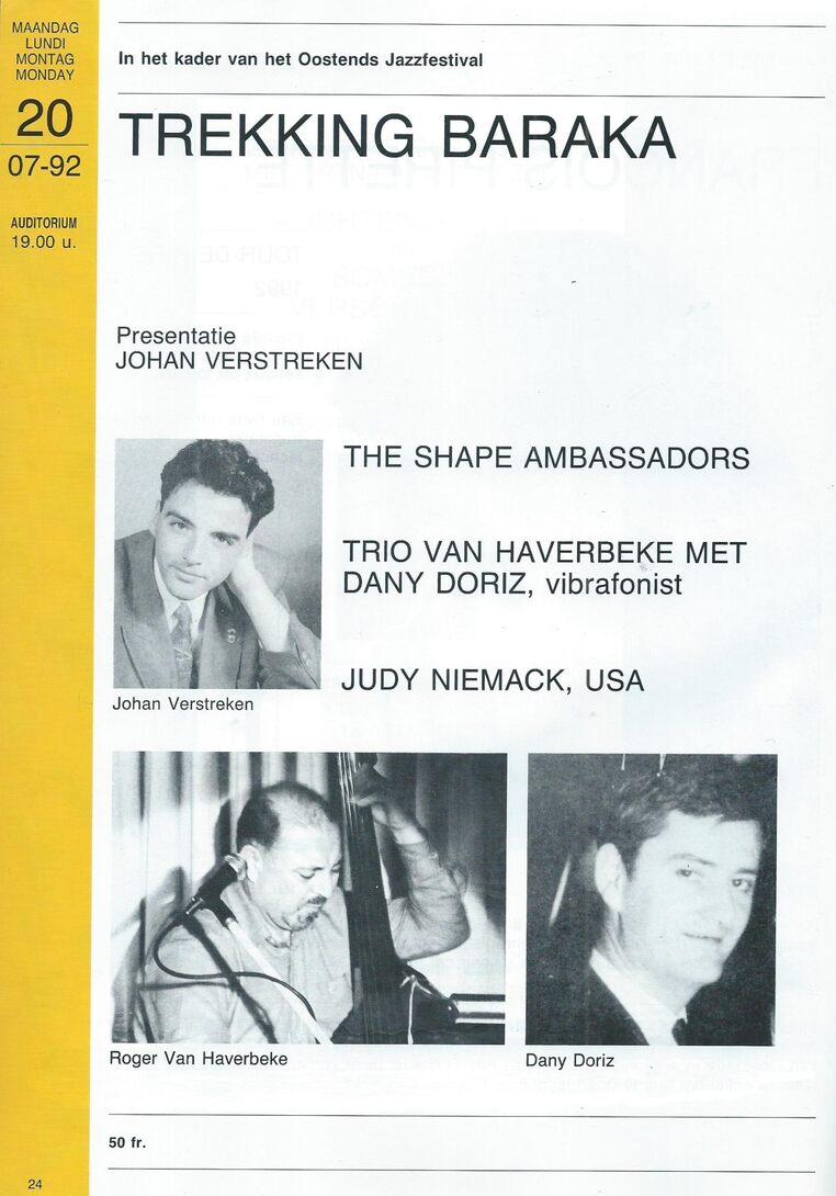 In het kader van het Oostends Jazzfestival. Presentatie : Johan Verstreken. Met : The Shape Ambassadors - Trio Van Haverbeke met Dany Doriz, vibrafonist - Judy Niemack