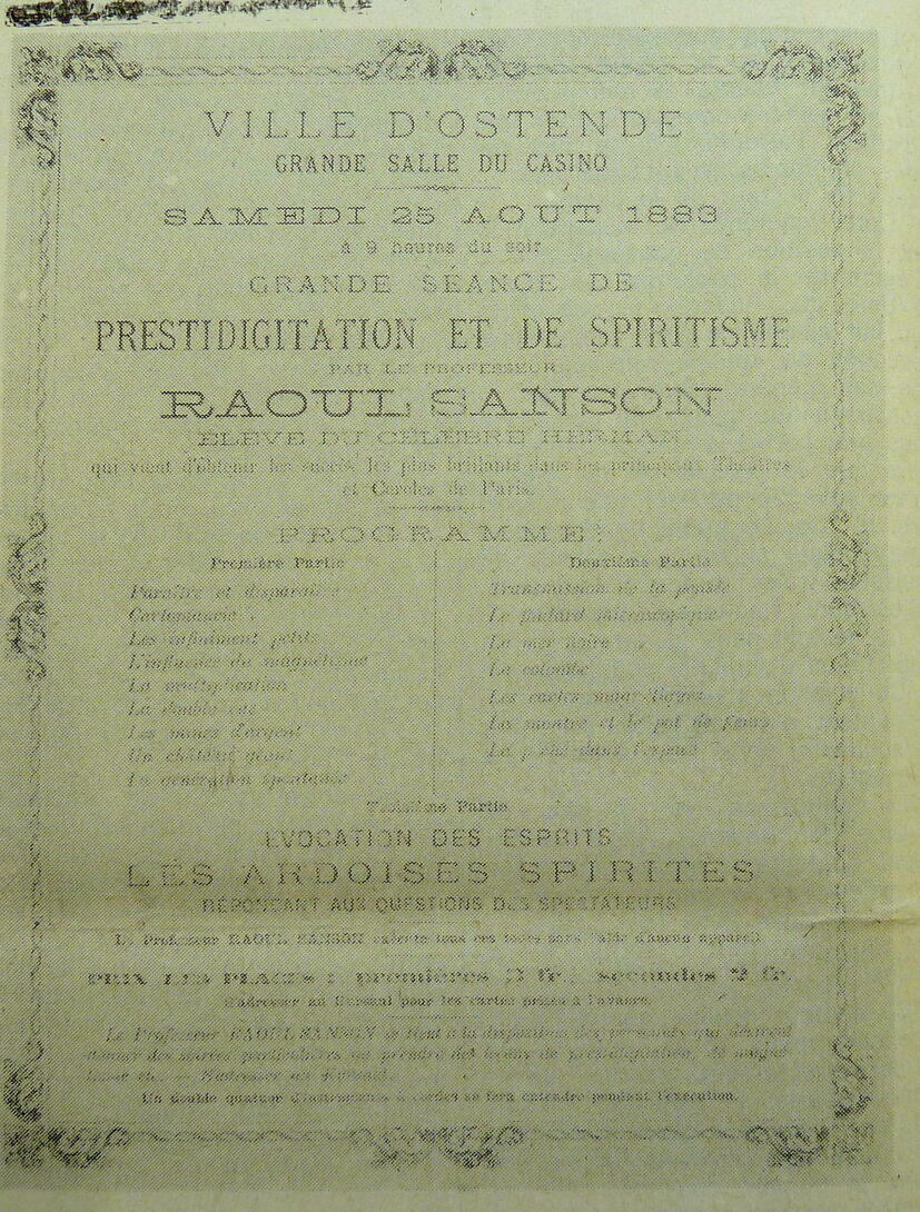 Ill. : Affiche : Ville d'Ostende. Grande salle du Casino. Grande séance de prestidigitation et de spiritisme. Raoul Sanson. 25/08/1883