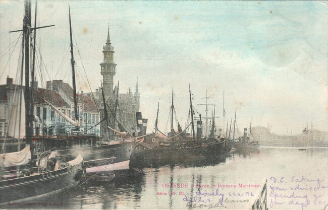 Sugg 7, 20. Ostende - Bassin et Bureaux Maritimes. - Bijgekleurde kaart. Vaartuigen gemeerd in het eerste handelsdok. Waaronder enkele vrachtschepen en wat verder stoomtreilers. Links zien we de Keizerskaai met op…