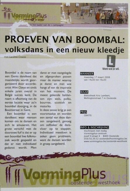 Affiche : Vormingplus. Proeven met boombal : volksdans in een nieuw kleedje. Bibliotheek Kris Lambert. 17/03/2008.
