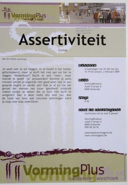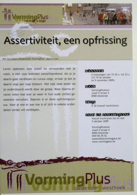 Affiche : Vormingplus. Assertiviteit, een opfrissing. VormingPlushuis. 12-19-26/10 en 9/11/2009