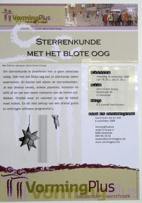 Affiche : Vormingplus. Sterrenkunde met het blote oog. Astra Event Group Oostende. 16/11/2009.