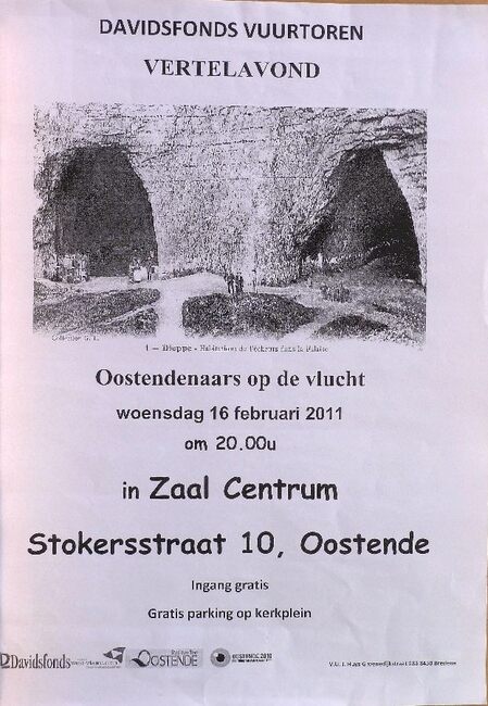 Affiche : Davidsfonds Vuurtoren. Vertelavond : Oostendenaars op de vlucht. Zaal Centrum. 16 februari 2011