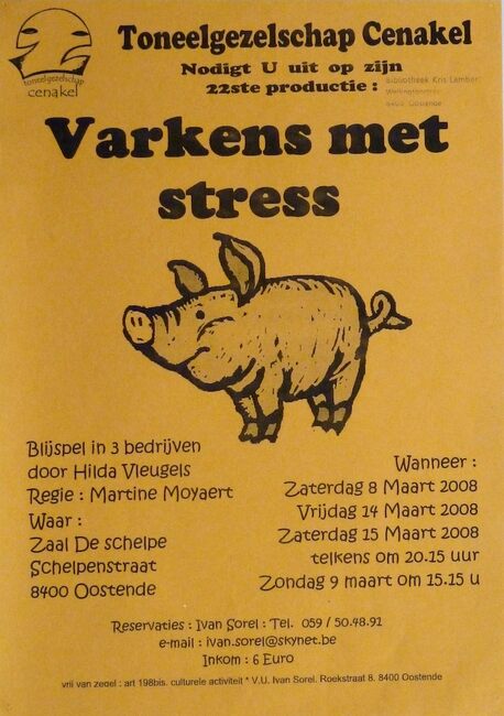 Affiche : Toneelgezelschap Cenakel. Varkens met stress. Zaal De Schelpe. 8-14-15/03/2008