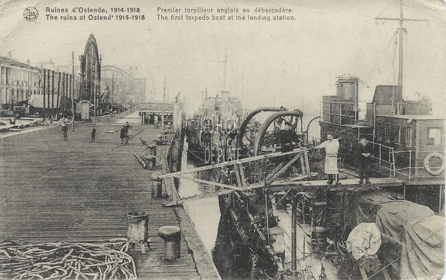 Nels. Edition J. Revyn, 14, rue du Canada, Bruxelles. - Ruines d'Ostende, 1914-1918 - Premier torpilleur anglais au débarcadère. The ruins at Ostend 1914-1918 - The first torpedoboat at the landing station. - Britse…