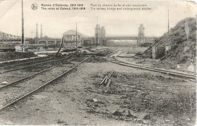 Nels. Edition J. Revyn, 14, rue du Canada, Bruxelles. - Ruines d'Ostende 1914-1918 - Pont du chemin de ver et abri souterrain. The ruins at Ostend 1914-1918 - The railway bridge and underground shelter. - Het…